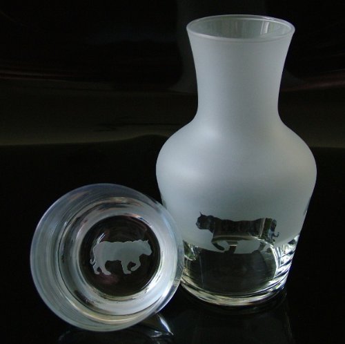 A two piece glass water set comprising of a water carafe featuring Tigers around its diameter & a tumbler which has a frosted Tiger on its base. The two piece set measures approx 8 inches in height. They are brand new & in perfect condition.They are handcrafted here in our glass studio in London. The glasses will be professionally wrapped in bubble wrap & will be posted within 2 working days of an order being received.