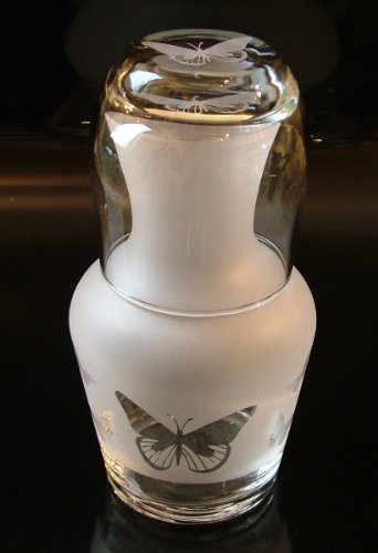 A two piece glass water set comprising of a water carafe featuring Butterflies around its diameter & a tumbler which has a frosted butterfly on its base.. The two piece set measures approx 8 inches in height. They are brand new & in perfect condition.They are handcrafted here in our glass studio in London. The glasses will be professionally wrapped in bubble wrap & will be posted within 2 working days of an order being received.