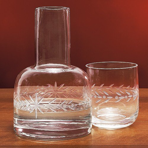 The perfect bedside drinking set This chic, cut glass carafe and drinking glass will take pride of place on your bedside table. Both the drinking glass and carafe feature a stunning etched embellishment that oozes style and elegance. This water and juice set is perfect for the bedroom, but is also ideal for providing refreshment in the garden or at your side as you relax around the home. Why not treat yourself or a loved one to this fabulous drinking set? Carafe measures 14 x 9cm.