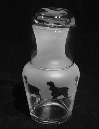 A two piece glass water set comprising of a water carafe featuring Cocker Spaniel Dogs around its diameter & a tumbler which has a frosted Cocker Spaniel Dog on its base.. The two piece set measures approx 8 inches in height. They are brand new & in perfect condition.They are handcrafted here in our glass studio in London. The glasses will be professionally wrapped in bubble wrap & will be posted within 2 working days of an order being received.