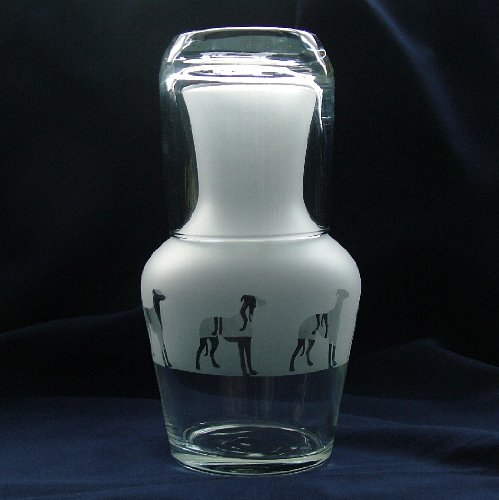 A two piece glass water set comprising of a water carafe featuring Greyhounds around its diameter & a tumbler which has a frosted Greyhound dog on its base.. The two piece set measures approx 8 inches in height. They are brand new & in perfect condition.They are handcrafted here in our glass studio in London. The glasses will be professionally wrapped in bubble wrap & will be posted within 2 working days of an order being received.