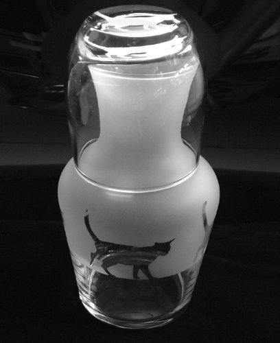 A two piece glass water set comprising of a water carafe featuring walking Cats around its diameter & a tumbler which has a frosted cat on its base.. The two piece set measures approx 8 inches in height. They are brand new & in perfect condition.They are handcrafted here in our glass studio in London. The glasses will be professionally wrapped in bubble wrap & will be posted within 2 working days of an order being received.