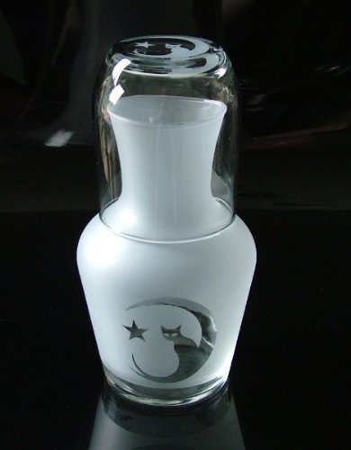 A two piece glass water set comprising of a water carafe featuring a cat & moon design around its diameter & a tumbler which has a frosted cat & moon on its base.. The two piece set measures approx 8 inches in height. They are brand new & in perfect condition.They are handcrafted here in our glass studio in London. The glasses will be professionally wrapped in bubble wrap & will be posted within 2 working days of an order being received.