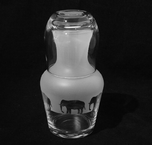 A two piece glass water set comprising of a water carafe featuring Elephants around its diameter & a tumbler which has a frosted Elephant on its base.. The two piece set measures approx 8 inches in height. They are brand new & in perfect condition.They are handcrafted here in our glass studio in London. The glasses will be professionally wrapped in bubble wrap & will be posted within 2 working days of an order being received