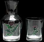 Water Set comprising carafe and glass in a Thistle Design. Handpainted and designed in the UK by Beverley Gallagher, these significant and expressive gifts are ideal for birthdays, anniversaries, Scottish Weddings, engagements, Christmas, Hogmanay, Valentines Day, Mothers Day, Easter, St Andrews Day, and special celebrations.