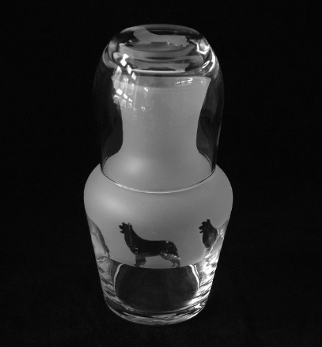 A two piece glass water set comprising of a water carafe featuring Border Collies around its diameter & a tumbler which has a frosted Border Collie on its base.. The two piece set measures approx 8 inches in height. They are brand new & in perfect condition.They are handcrafted here in our glass studio in London. The glasses will be professionally wrapped in bubble wrap & will be posted within 2 working days of an order being received.