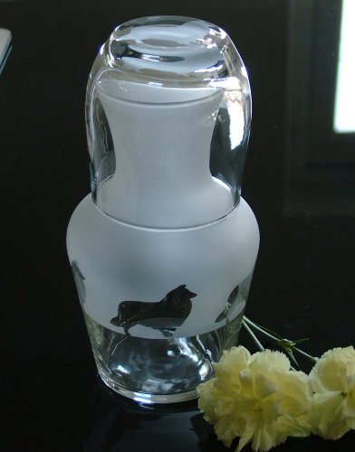 A two piece glass water set comprising of a water carafe featuring Rough Collies around its diameter & a tumbler which has a frosted Rough Collie on its base.. The two piece set measures approx 8 inches in height. They are brand new & in perfect condition.They are handcrafted here in our glass studio in London. The glasses will be professionally wrapped in bubble wrap & will be posted within 2 working days of an order being received