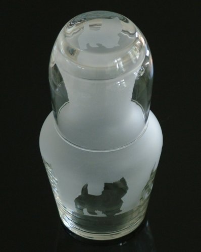A two piece glass water set comprising of a water carafe featuring Westies Dogs around its diameter & a tumbler which has a frosted Westie Dog on its base.. The two piece set measures approx 8 inches in height. They are brand new & in perfect condition.They are handcrafted here in our glass studio in London. The glasses will be professionally wrapped in bubble wrap & will be posted within 2 working days of an order being received